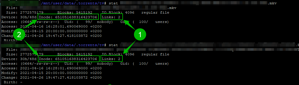 - Inode: if the numbers match, you know the files are hardlinked