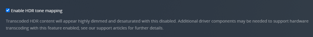 Plex Media Server owners can choose which tone mapping algorithm is used when transcoding HDR content to SDR. Note: this feature is not yet available on Intel-based Windows systems.